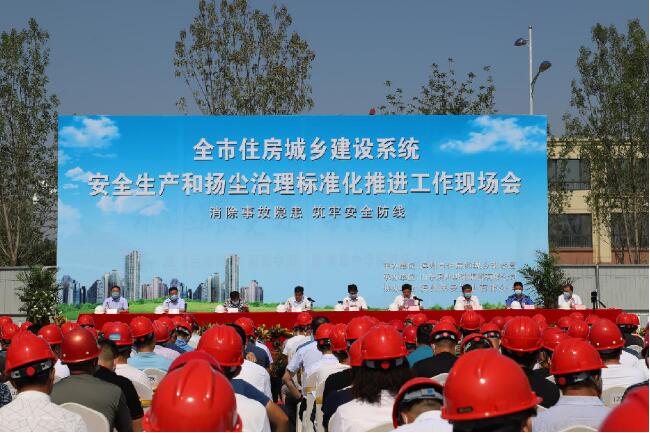 為了進(jìn)一步提升我市房屋建筑工程安全防護(hù)、揚(yáng)塵治理標(biāo)準(zhǔn)化和規(guī)范化水平,推動(dòng)我市建筑企業(yè)安全防護(hù)和揚(yáng)塵治理水平再上新臺(tái)階。6月20日,全市房屋建筑工程安全生產(chǎn)和揚(yáng)塵治理標(biāo)準(zhǔn)化現(xiàn)場(chǎng)觀摩活動(dòng)在山東濱州城建集團(tuán)有限公司承建的民安鵲華苑工程施工現(xiàn)場(chǎng)舉行,活動(dòng)圍繞2020年全國(guó)安全生產(chǎn)月——“消除事故隱患,筑牢安全防線”的主題,著眼當(dāng)前全市住建領(lǐng)域的揚(yáng)塵治理形勢(shì),大力營(yíng)造“人人重視安全、人人關(guān)注環(huán)保”的良好氛圍,掀起安全生產(chǎn)和揚(yáng)塵治理標(biāo)準(zhǔn)化工地的創(chuàng)建高潮。此次觀摩活動(dòng)由濱州市住房和城鄉(xiāng)建設(shè)局主辦,山東濱州城建集團(tuán)有限公司承辦,濱州民安置業(yè)有限公司協(xié)辦。市政府辦公室黨組成員辦公室副主任梅振鵬、市住房和城鄉(xiāng)建設(shè)局局長(zhǎng)孫文利、市住房和城鄉(xiāng)建設(shè)局副局長(zhǎng)張海濱、市城建服務(wù)中心副主任張樹(shù)林、濱城區(qū)住房和城鄉(xiāng)建設(shè)局局長(zhǎng)張亮、開(kāi)發(fā)區(qū)綜合執(zhí)法局局長(zhǎng)封涌波、濱州城建集團(tuán)有限公司董事長(zhǎng)曹慶訓(xùn)、總經(jīng)理孟慶國(guó)、濱州民安置業(yè)有限公司經(jīng)理曹亮以及濱城區(qū)、開(kāi)發(fā)區(qū)建設(shè)主管部門(mén)安全、揚(yáng)塵管理機(jī)構(gòu)負(fù)責(zé)人;市城建服務(wù)中心、市市政服務(wù)中心、市住建局建管質(zhì)安科、人防工程科、開(kāi)發(fā)中心、市質(zhì)管站、綜合執(zhí)法大隊(duì)、市安管站建筑工地?fù)P塵治理包保片區(qū)人員;市本級(jí)、濱城區(qū)、開(kāi)發(fā)區(qū)各房屋建筑工地項(xiàng)目經(jīng)理。共計(jì)約220余人出席觀摩會(huì)。